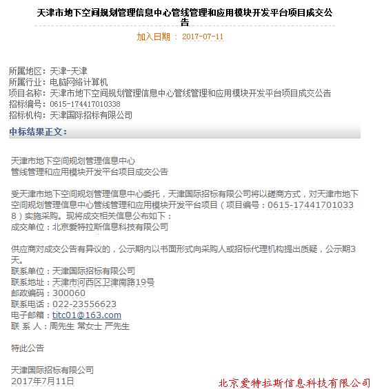 7月11日我公司(北京愛(ài)特拉斯信息科技有限公司)在天津市地下空間規劃管理信息中心管線(xiàn)管理和應用模塊開(kāi)發(fā)平臺項目招標的競標中,憑借過(guò)硬的產(chǎn)品質(zhì)量,扎實(shí)高效的工作作風(fēng),卓越的運作團隊和良好的企業(yè)信譽(yù),以絕對優(yōu)勢順利中標。