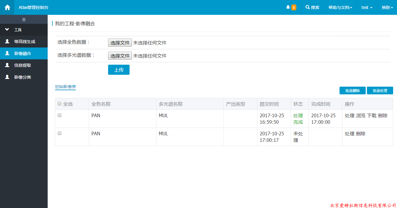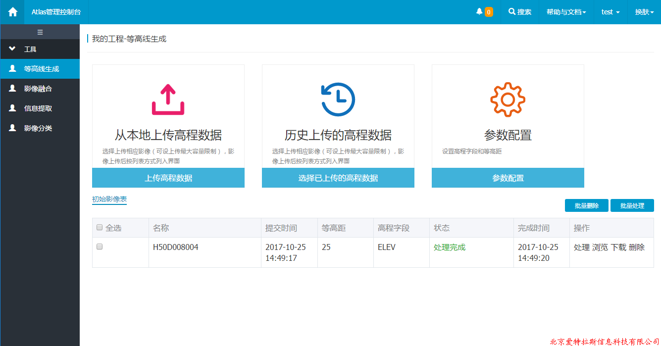 本公司自主研發(fā)愛(ài)特拉斯遙感影像在線(xiàn)處理與解譯服務(wù)平臺,經(jīng)過(guò)不斷開(kāi)發(fā)和完善,于今日將DEM等高線(xiàn)生成與影像融合等核心模塊研發(fā)完成,進(jìn)入正式試用階段。