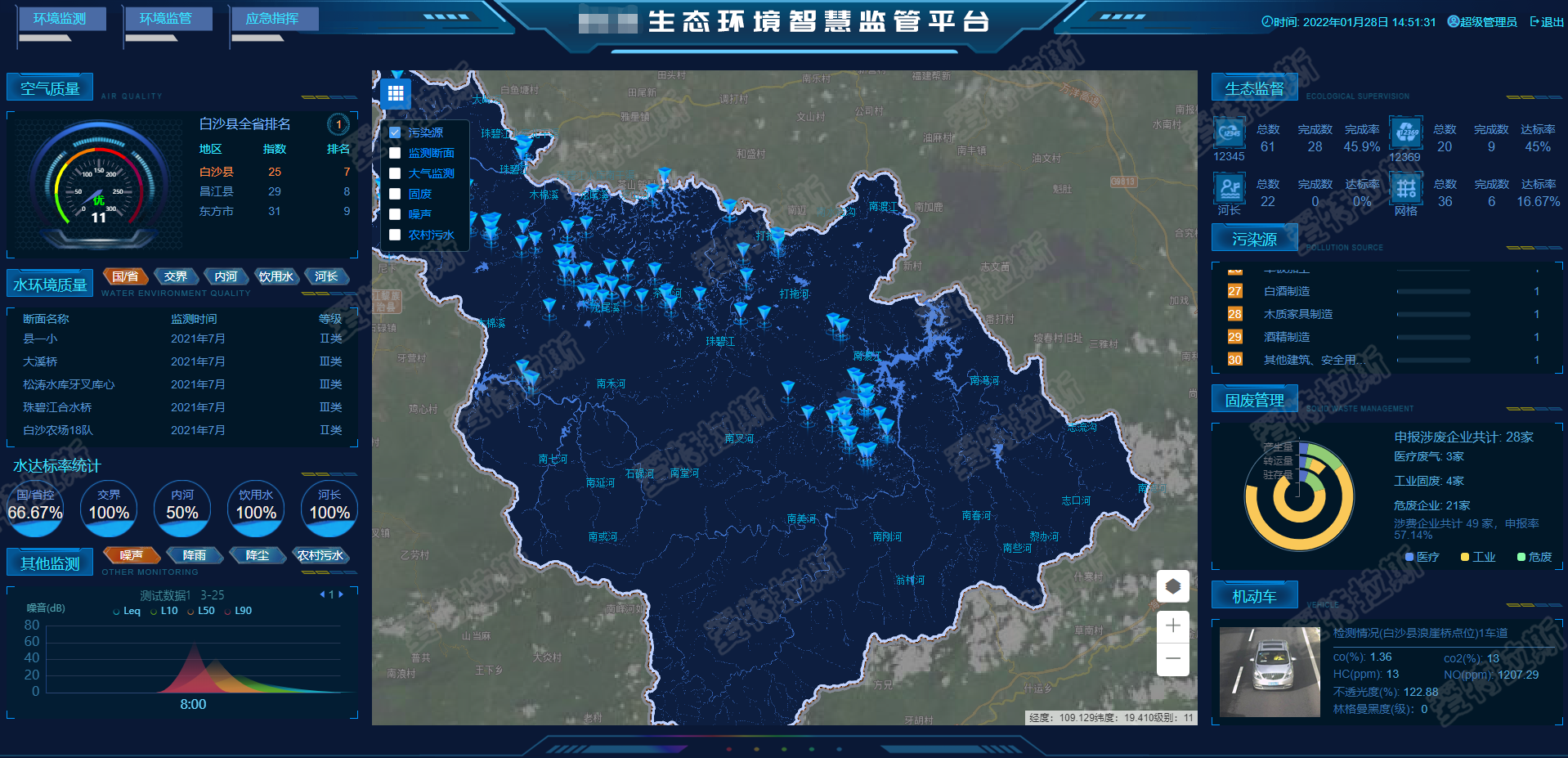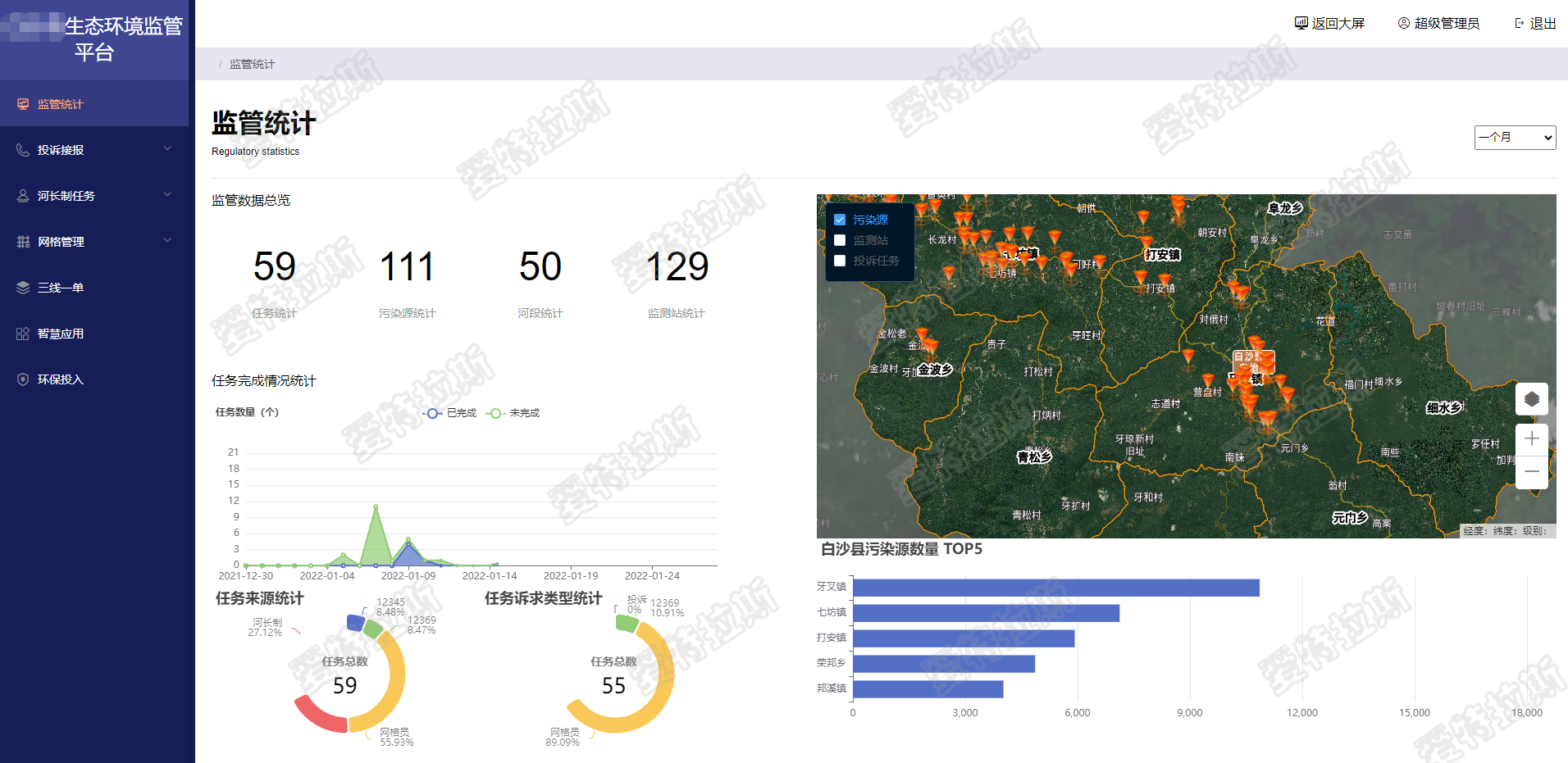 對資源整合分析實(shí)現生態(tài)環(huán)境一張圖。通過(guò)監測提供的數據可以在此頁(yè)面提供可視化的生態(tài)環(huán)境指標、列表、統計圖等,并且可以在地圖上顯示出污染源、水、大氣、固廢、噪音農村污水的具體點(diǎn)位和詳情描述。通過(guò)監管提供的數據可以在此頁(yè)面展示12345、12369、河長(cháng)、網(wǎng)格的任務(wù)數和完成率和達標率。 |