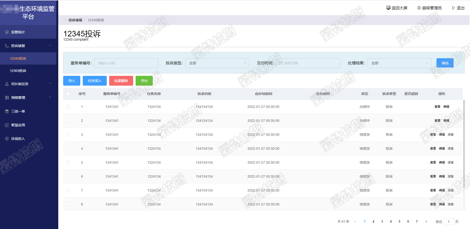 主要是對人員和任務(wù)進(jìn)行分配管理的這么一個(gè)系統。根據12345、12369、河長(cháng)、網(wǎng)格員的投訴或上報去進(jìn)行任務(wù)的管理,對于收錄的任務(wù)派發(fā)給當地的人員去進(jìn)行處理反饋。根據處理情況也會(huì )顯示在監管統計頁(yè)面中進(jìn)行可視化的統計展示,更夠更好的進(jìn)行分析匯總。河長(cháng)可以通過(guò)河長(cháng)地圖更好的去了解河流的走向和自身所管理的范圍。網(wǎng)格員可以通過(guò)網(wǎng)格信息去查看所屬網(wǎng)格目前現有的任務(wù)數量。 |