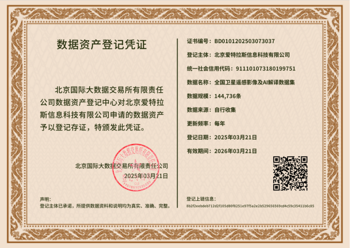近年來(lái),隨著(zhù)數字經(jīng)濟的快速發(fā)展,數據作為核心生產(chǎn)要素的重要性日益凸顯。黨中央、國務(wù)院高度重視數據要素的價(jià)值釋放和安全管理,出臺了一系列政策文件,推動(dòng)數據資產(chǎn)化進(jìn)程。我司積極響應政策號召,充分發(fā)揮地理信息技術(shù)優(yōu)勢,完成電子地圖、衛星遙感、AI解譯等多類(lèi)數據資源的登記、審批、賦碼、公示等流程,與近日順利完成由北京國際大數據交易所頒發(fā)數據資產(chǎn)登記書(shū)。