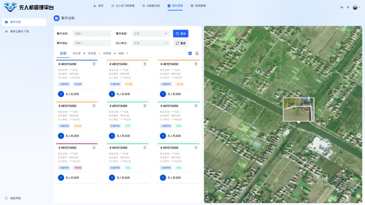該模塊集成八大核心功能,全面支撐事件全生命周期管理。事件臺賬功能實(shí)現事件數據的標準化存儲與動(dòng)態(tài)更新;事件立案與下發(fā)功能確保任務(wù)精準指派、責任到人;事件處置功能支持現場(chǎng)情況實(shí)時(shí)記錄與反饋;事件核查功能通過(guò)無(wú)人機復查驗證處置成效;事件結案功能完成信息歸檔,形成完整檔案;事件查詢(xún)功能支持多維度組合檢索,快速定位目標事件;事件上圖功能采用不同圖標和顏色,在地圖上分層展示事件分布;事件詳情查看功能可一鍵查閱事件處理全流程信息,實(shí)現透明化管理。通過(guò)這些功能,平臺有效提升了跨部門(mén)協(xié)同效率與事件處置規范性。